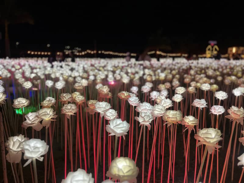 「1万本のバラ」をモチーフにしたガーデンカフェで、夜には、LEDのバラたちが一斉にライトアップされます。