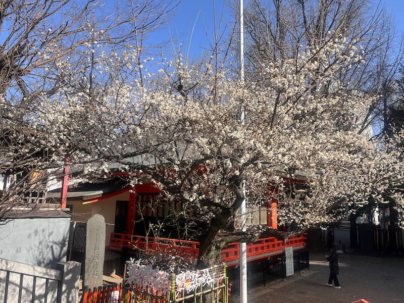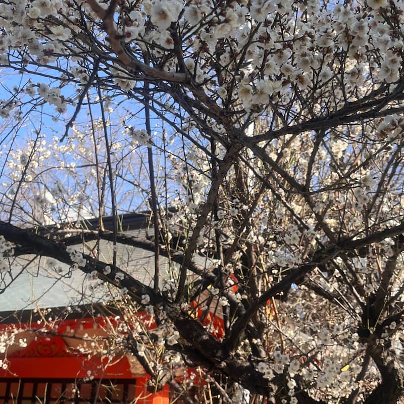 花園神社の境内に合祀されている、雷電神社の脇の梅の花は、今ちょうど満開を迎えています。